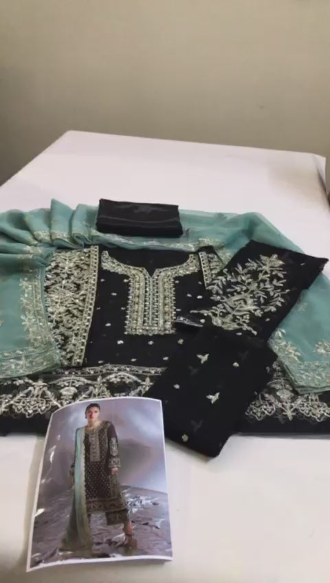 A masterpiece of elegance β this black chiffon outfit is beautifully enhanced with light gold glitter sequins, sage green threadwork, and fine gold zari embroidery. The front carries heavy detailing with attached embroidered panels, complemented by an embroidered back and sleeves. Daman, sleeves, and trouser borders are finished with delicate lace for a graceful touch.