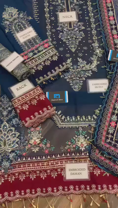 This premium chiffon embroidered suit with digital silk dupatta and jamawar trouser is perfect for weddings, festive occasions, and formal gatherings. With detailed sequin embroidery, hand embellishments, and stylish tassels, it offers a graceful blend of elegance and sophistication.